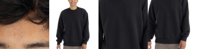 10-ounce, 80/20 combed ring spun cotton/recycled polyester fleece 75/25 cotton/polyester (Heather Gray) 100% cotton face Shoulder to shoulder binding Tear-away label Halfmoon at back neck 2x2 rib knit collar, cuffs and hem Dropped shoulders Side seamed Oversized fit