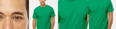 4.3 oz./yd², 50/50 combed ring-spun USA premium cotton/polyester fine jersey, 30 singles Reactive-dyed Pre-washed to minimize shrinkage Ribbed crewneck collar Taped neck and shoulders Side seams Double-needle sleeves and bottom hem Tear away label USMCA Certified This product meets the following Sustainable Style subcategories: