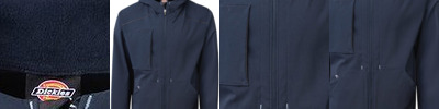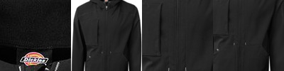 8.5 oz./yd², 92/8 polyester/spandex elastane WeatherWeave fabric that protects against water and wind DWR finish Three-piece hood with bill extension Patented SafeChinch drawcord feature Center front full-zip with Dickies branded pull Right chest security pocket with zipper Split-pouch pockets with internal cell phone pockets on both sides Left sleeve pocket Dickies logo on left bottom pocket Home wash Regular sizes available under style PH10