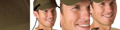 70/30 cotton/nylon Mesh on the two side panels Four-panel, low-profile CoolPlus® terry cloth sweatband Shirt collar clip and cord in the rear UPF 45+ protection Adjustable flexible nylon webbing outside hook and loop closure