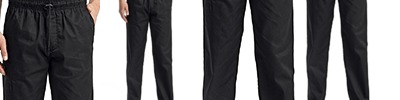 6 oz., 65% polyester, 35% cotton twill; Pull-on chef's trousers ; Elasticated waist with drawstring; Zip fly fastening; Handy pocket on the right leg, left rear patch pocket; Easycare & high temperature wash ;