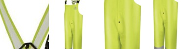 10 oz./yd², FR Polyurethane on a Knit Flame-Resistant Treated Cotton, Water-Repellent Non-conductive durable hardware 2" reflective striping › Elasticized shoulder straps with non-conductive adjustable hardware Take-up tabs at ankles Waterproof Arc Rating ATPV 24 calories/cm² EBT 28 calories/cm²