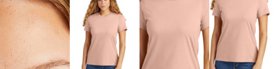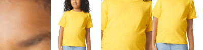 4.6-ounce, 60/40 ring spun cotton/polyester CVC blend Subtle heather texture on all colors except Pitch Black and White Recycled, high-performing black tear-away label Softstyle's high stitch density fabric offers a smoother printing surface Narrow width, rib collar Taped neck and shoulders Modern classic fit, seamless body Double-needle hem Rib cuffs