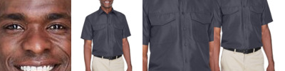 3.5 oz./yd²/115 gsm (US), 5.8 oz./L yd (CA), 100% polyester ripstop Moisture-wicking performance UPF 40+ protection Anti-microbial properties Structured collar with integrated collar stays Chest pocket with pen slots Full-button front Polyester mesh lining in upper back Back venting for breathability