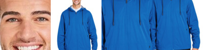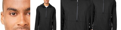 1.5 oz./yd², 100% polyester taffeta with water-resistant finish Encased elastic at hood opening for superior weather protection Reflective tape details at front and back shoulders and placket Two-snap closure at placket with dyed-to-match plastic snaps Packable into self back pocket with hook and loop closure Shockcord at lower hem for added weather protection