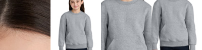 The youth version of this popular cozy crew with a hoodie-style front pocket. 7.8-ounce, 50/50 cotton/polyester fleece Air jet yarn for softness Front pouch pocket Tear-away label
